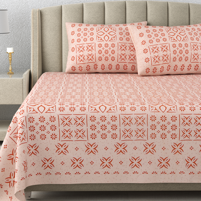 Premium 280 TC 100% Cotton King Size Bedsheet with 2 Pillow covers- 90 x 108 Inches – Patch Peach