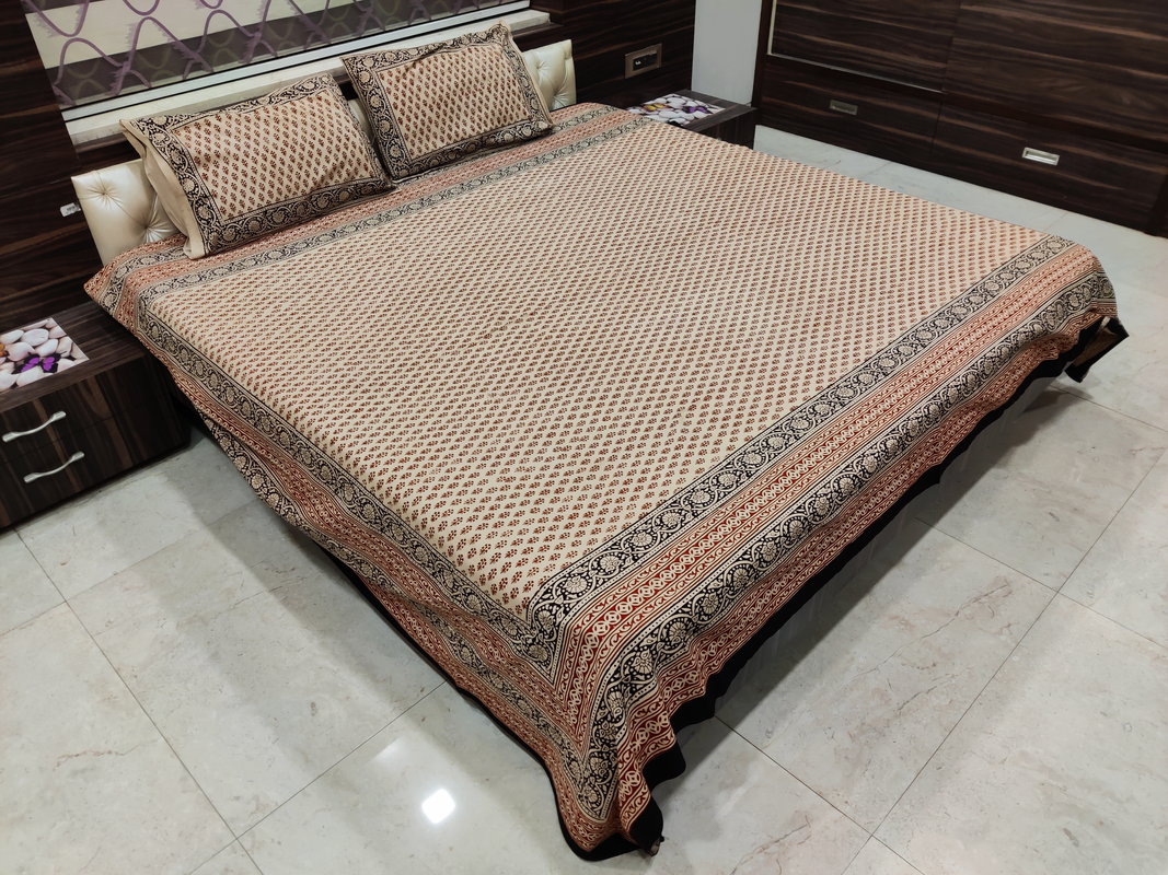 This pure cotton double bed sheet is made with traditional Bagru block printing process in Rajasthan. This double bed bedsheet with two pillow covers, is made of cotton fabric. This is suitable for king size and queen size bed even with bigger mattress due to their large size of 90 x 108 inches. The block print of Bagru is famous for natural colour bed sheet, and this bed sheet is hand made with Bagru (Press) Block printing process, by hand pressing each design of block manually, giving it a perfect look. These mud-coloured bed sheets will make your room decor beautiful. It is easily washable at home and gets vibrant with every wash. Jaipur Dohar specializes in home decor with hand block printed Dohar, bed sheets and quilts. Give your room a traditional vibrant look with heritage bedsheets from Jaipur Dohar.
